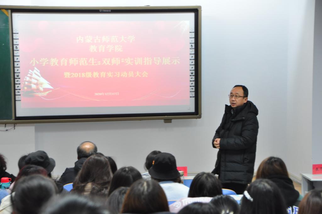 为了进一步加强师范生的教学实训指导的力度,增强学生“全学期实习”的实践经验,新葡萄88805官网于12月17日下午,在行知楼321举办了“新葡萄88805官网小学教育师范生‘双师’实训指导展示会暨2018级教育实习动员大会”。会议邀请呼和浩特市教研室数学教研员梁世伟、和林格尔县第一小学副校长王娜和呼和浩特市新城区教研室刘霞等三位教师为点评嘉宾,小学教育的全体指导教师也参加了本次活动,形成校内校外“双师”共同对2018级同学的现场教学展示进行点评。会议由实践教学部副主任马红斐老师主持,学院院长米俊魁教授、副院长边琦教授参加了本次展示活动。2018级小学教育专业的同学们全体参加。