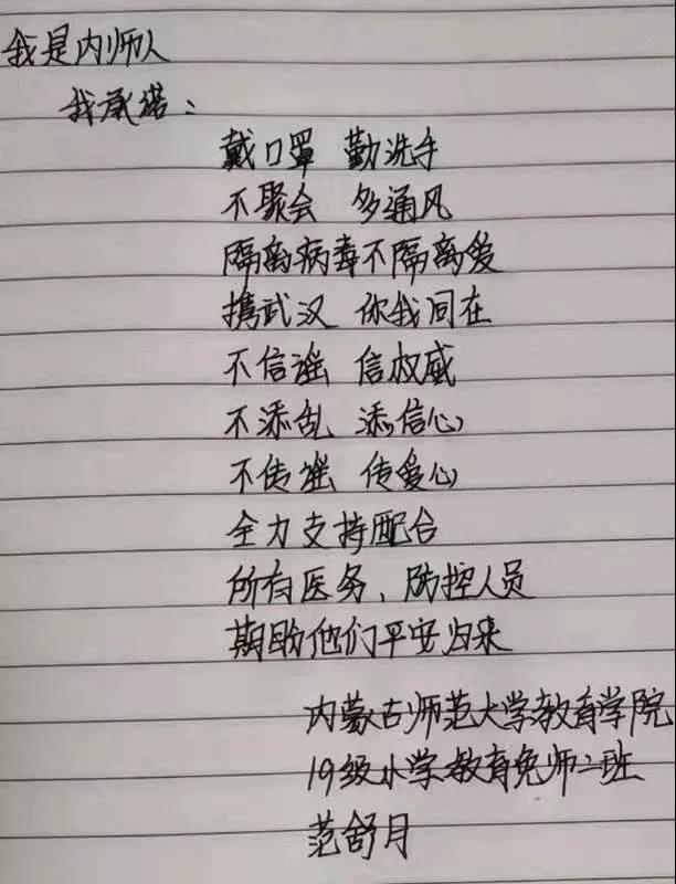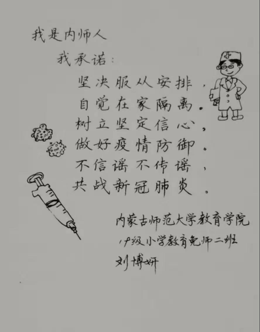 为落实好中央、自治区和学校应对新型冠状病毒感染肺炎相关工作精神,按照共青团中央、自治区团委“关于坚持党的领导,全团动员,在防控疫情阻击战中充分发挥共青团生力军和突击队作用的通知”要求,配合学校团委开展共青团防控疫情“十个一”专题教育活动,引导同学们正确认识疫情,积极应对疫情防控,新葡萄88805官网组织开展“防范疫情,从我做起!我是内师人,我承诺!”网络承诺接力活动,发动学生党员、学生干部带领全院学生践行承诺,积极响应号召,服从指挥,保持联络通畅,不提前返校,做到戴口罩、勤洗手,少出门、不聚餐,不信谣、不传谣、不造谣,做运动、不虚度。同学们写下承诺,以笔战“疫”,用实际行动彰显当代大学生的责任与担当,与前线的“逆行者”共同筑起“抗疫”新长城!