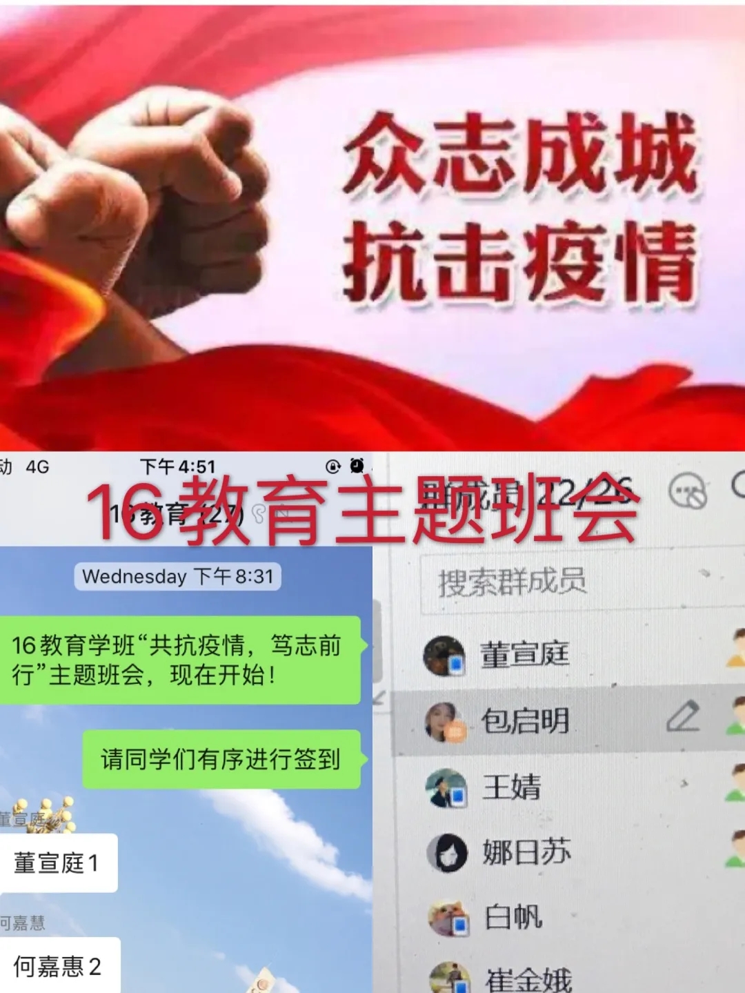 班会由各班班主任主持,充分利用企业微信、微信、QQ、钉钉等现代信息技术手段。班会内容主要围绕空中课堂我打卡、疫情防控我承诺、学霸养成我有招、生涯跨越任我行、排忧解难有我在五个方面展开,旨在按照“按期开课,延期返校”的原则,及时做好学生网络上课动员工作,明确网上教学安排和学习纪律,营造良好的网络学习学风;引导学生正确认识疫情 ,科学了解疫情;倡导学生严格遵守关于疫情防控的各项规定,每日定时在“健康情况日报系统”打卡,彰显当代大学生的责任与担当;激发学生们的学习积极性和主动性,共建团结和谐、健康向上的优良学风;就疫情当下毕业生面临的毕业论文答辩、考研复试、就业等问题,对毕业班学生进行深入细致的解答,开展精准指导服务;准确掌握班级学生思想动态、心理状况、学习生活情况,做好心理关怀。