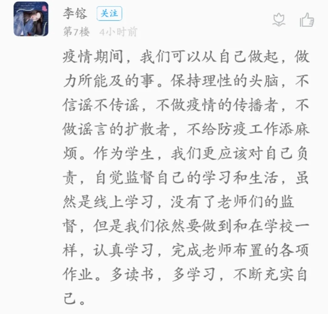 今天,我们又以特殊的方式——网上收看了黄雅丽书记的《开学第一课》。黄书记的讲话让我回想起《孟子》中的话:“生于忧患,死于安乐”,其实不论是国家还是个人都是一样的,作为一个国家,中国以令其他国家望其颈背的能力处理好这场攻坚战。那么身为中国人,身为中国青年的我们更应该传扬国家的精神。“士不可以不弘毅,任重而道远”,这是我们祖先就曾告诉我们的道理。如今当是少年破敌时,是国家需要我们的时候,也是我们自己走向未来的重要时刻。
